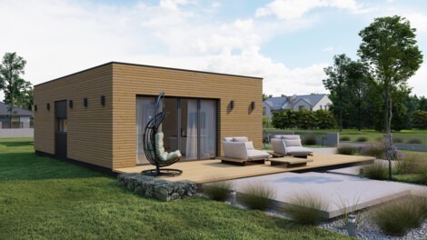 Parterowy budynek o powierzchni użytkowej wynoszącej 54,5 m2 dla 2 osób. Prosta i nowoczesna bryła, zgodna z obecnymi trendami z częściowo zadaszonym tarasem.